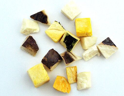 カットした国産のかぼちゃとサツマイモを、蒸かして甘みを引き出し、フリーズドライ加工でサクサク食感に仕上げました。