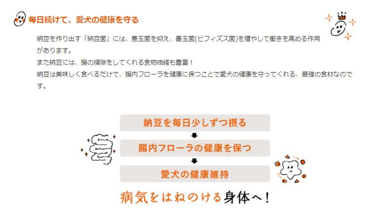 栄養豊富な納豆は、ワンコの身体にとても良い食品。実はワンコの大好物でもあります。ドットわんでは"生きた納豆菌"を届けたいという想いから、ワンコ用に熟成度合を高めた良質な納豆をフリーズドライ加工しました。サラリとした手触りで与えやすい、ドットわん不動のロングセラー商品です。原材料国産納豆(カナダ・アメリカ産大豆使用)(遺伝子組換えでない)成分値粗たん白質…41.0%以上