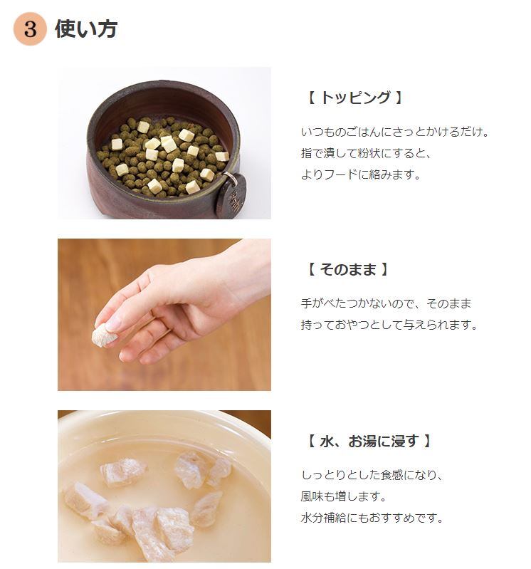サラリとした手触りで与えやすく、そのままはもちろん、ぬるま湯に浸したり、つぶしてふりかけにするなど、手軽にアレンジできる点も魅力です。保証成分粗タンパク質:79.0%以上