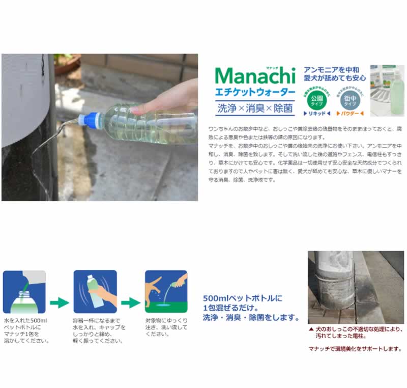 ※マナッチ(液体)は、上記原料にて設計されており、安全な原料のみにて作られており、人やペットに害は無く、万が一愛犬が舐めても安心な草木や環境に優しい製品です。