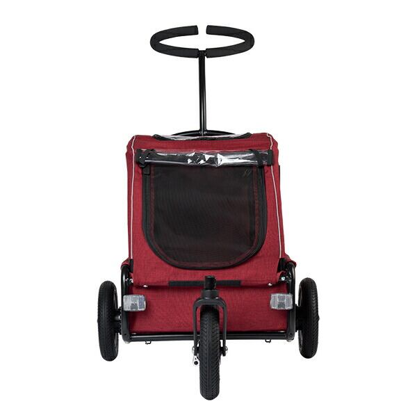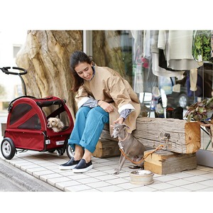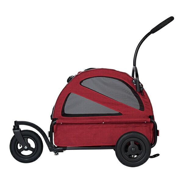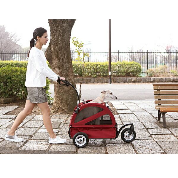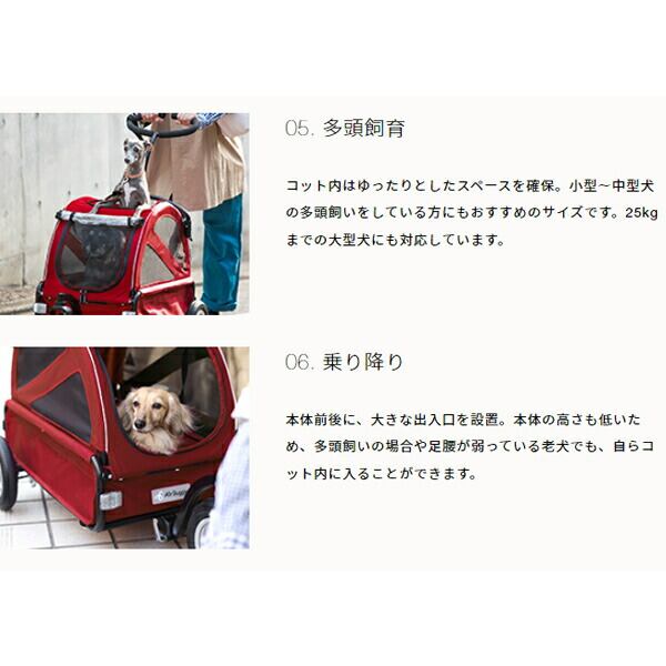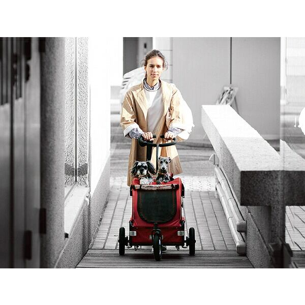 中型犬や小型犬の多頭飼いに人気の中型モデル。最大25kgまでの重さに対応します。ハンドル位置が高めに設計されているため、腰に負担がかからずスムーズな走行をお楽しみいただけます。また、愛犬が自ら乗り降りできる設計で抱きあげる必要がありません。タイヤを外せばハウスとしても使用可能なほか、折りたたむと厚さ26cmのコンパクトサイズになるため、車での移動時などにもかさばりません。フロント・リア両サイドにリフレクターを装備し、暗い夜道でも安心。カラーラインナップに新色のカモフラージュが追加されました。