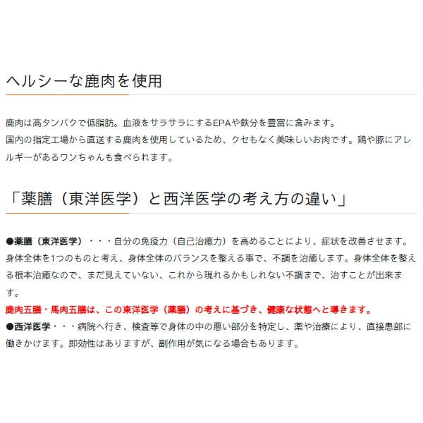 商品名は「馬肉・鹿肉に五種の薬膳を配合した」という意味を込め、パッケージは漢方薬をイメージした赤、紫、金を基調に、体が循環し流れていくイメージをデザインしています。カロリーカロリー:295kcal/100g原産国日本