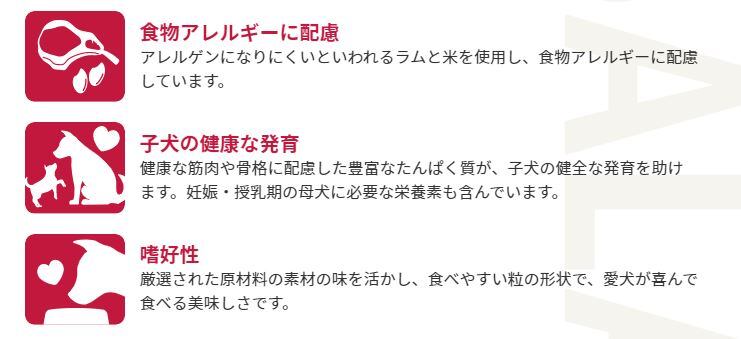 ラム肉と米を主原料にして食物アレルギーに配慮しています。保証成分粗タンパク質:27.0%以上
