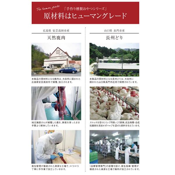 抗生物質・合成抗菌剤を飼料に一切添加しない「安心・安全」な山口県産長州どりの胸肉を一つ一つ手間ひまかけて作った本物の燻製です。