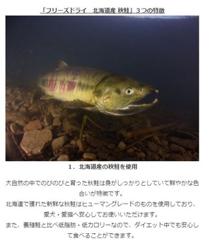 水分:1.4%以下原材料秋鮭(北海道産)サイズ17g代謝エネルギー358kcal / 100g原産国日本(北海道)