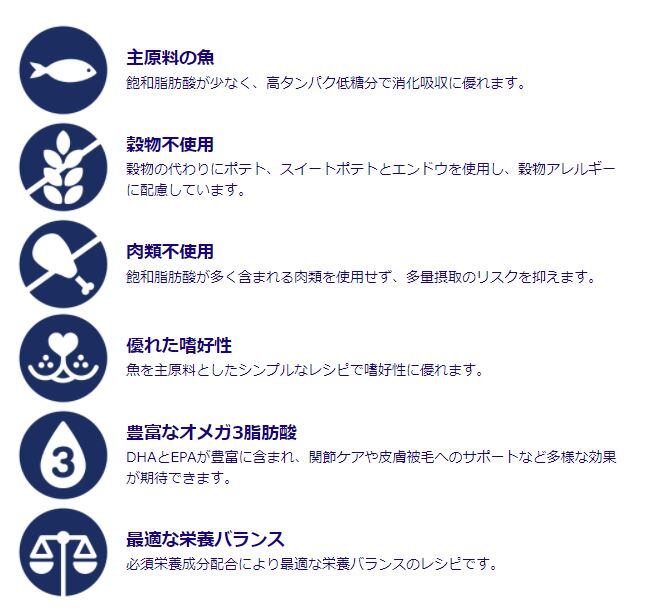 たんぱく質の供給源として新鮮な魚を使用し、魚由来のオメガ3およびオメガ6をバランスよく豊富に摂取することが可能です。