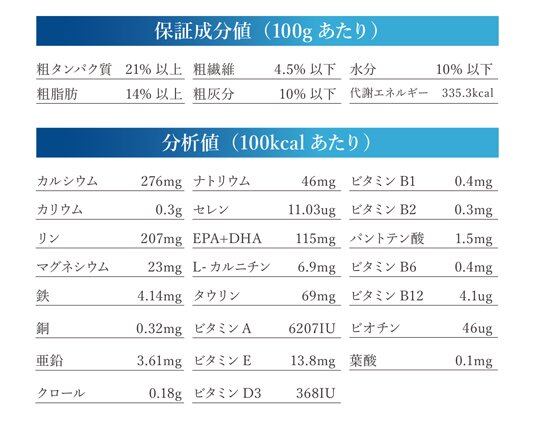 粗脂肪 14% 以上/粗灰分 10% 以下/代謝エネルギー 335.3kcal