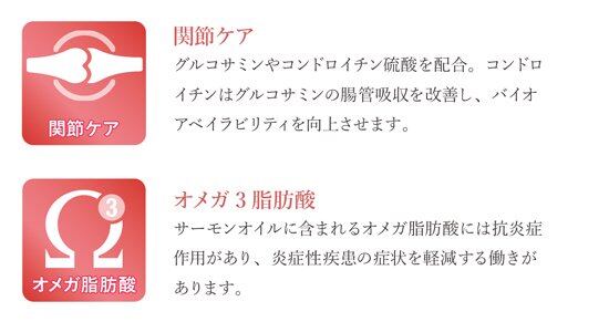 フリーラジカルを中和するメロン果汁、関節をサポートするボスウェリアセラータ、腸内細菌叢を確保するキシロオリゴ糖が配合されています。オメガ 3 脂肪酸とエイコサペンタエン酸、ビタミン E を含んだ設計となっています。