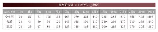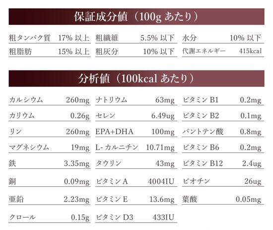 粗脂肪 15% 以上/粗灰分 10% 以下/代謝エネルギー 415kcal