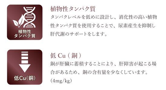 消化性に優れた植物性タンパク質を豊富に含み、銅含有量を制限しています。また、高カロリー設計で食欲不振でも十分な栄養補給が可能となるように配慮しています。