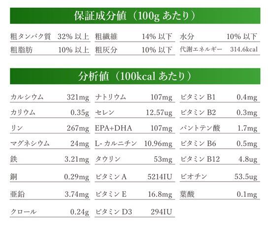 粗脂肪 10% 以上/粗灰分 10% 以下/代謝エネルギー 314.6kcal