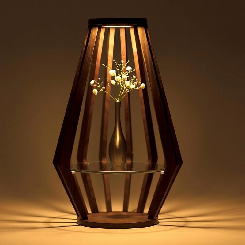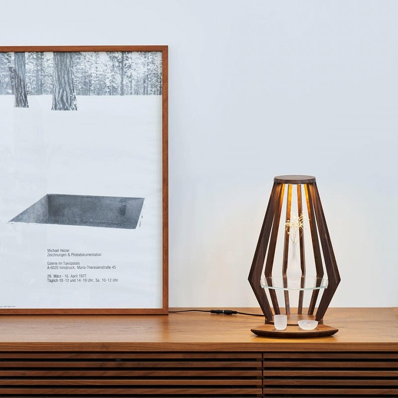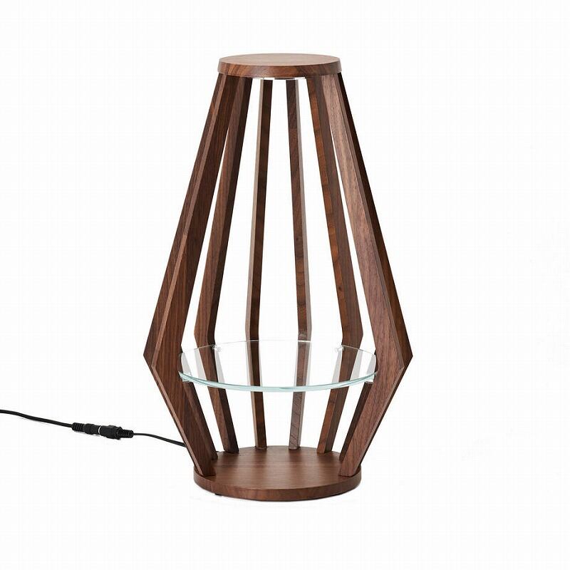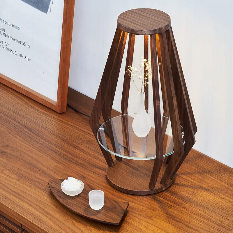 上部には調光機能付きLEDが取り付けてあり、ロウソクに火を灯すように、自分好みの明るさに調整することができます。木部の素材はウォールナットの無垢材を使用。棚板は高透過の白色ガラスを使っています。本来の自分に戻れる、「癒しの場所」を作り出してください。