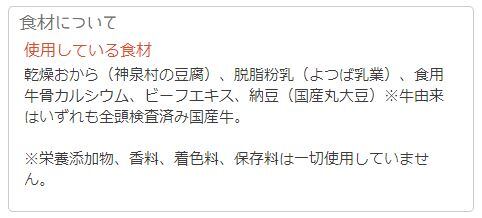 原材料乾燥おから(神泉村の豆腐)、脱脂粉乳(よつば乳業)、食用牛骨カルシウム、ビーフエキス、納豆(国産丸大豆)※牛由来はいずれも全頭検査済み国産牛。