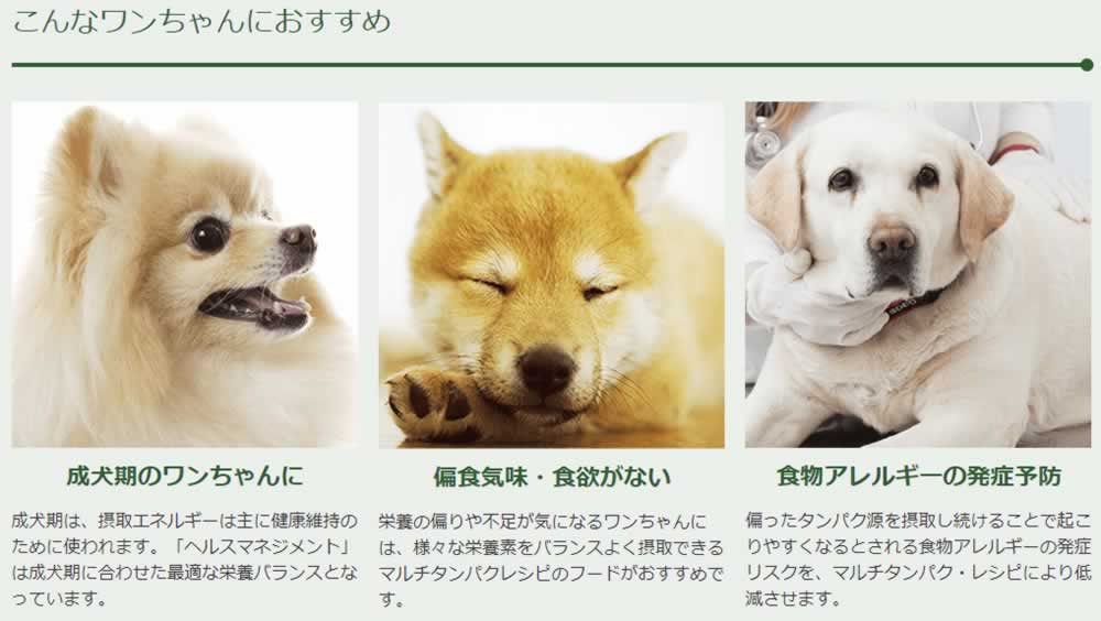 「ヘルスマネジメント」は、アレルギー源になりにくい上質なラム、ダックなどの新鮮素材のみを使用し、成長期〜維持期過程での健康状態を良好に保つ為に必要な原材料・栄養素をバランスよく配合した、マルチタンパク・レシピです。