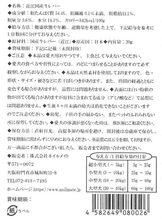 【メール便】WANタイム 近江牛 レバー(肝臓) ジャーキー 20g<br>犬用 おやつ 国産牛 ブランド牛 無添加 無着色 無香料 低温乾燥