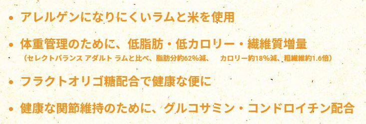 セレクトバランス ライト ラムは、生後1才以上の肥満・運動不足の成犬におすすめの総合栄養食です。