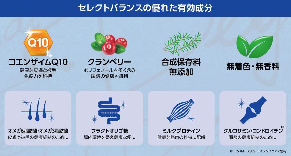 セレクトバランス アダルトは、生後1才以上の成犬に必要な栄養をバランスよく配合した総合栄養食です。