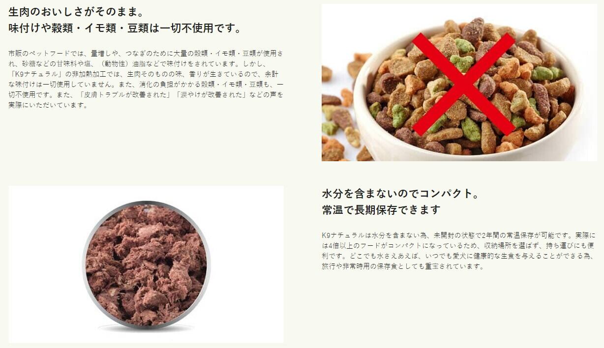 K9ナチュラルは、原材料の99%以上に自然食材を使用し、その栄養や風味を最大限に生かすため、原材料の加工を最小限に抑えながら、非加熱で製造しています。 そのため、原材料の収穫時期やサプライヤー(供給元)の違い、季節による家畜・家禽の脂肪分の違い、気候による野菜・果物などの成分の違いなど、素材の特長がそのまま、粒に反映されるため、保証成分値の範囲内ではありますが、粒の形状や、硬さ、色や香りなど、違いがあります。 また、一般的なドライフードのように、肉食動物である犬や猫にとって不要な、穀類・イモ類・豆類などの、粘性の高い、ツナギや量増しとしての原材料を一切、使用していないため、1粒1粒が柔らかく、簡単に、ほぐせるようになっています。 K9ナチュラルは、基本的な与え方として、本来の食事に近づけるために、生食の水分値に戻してから与えていただくフードですので、粉状になっているものはそのまま、粒状のものはくずしてから、水かぬるま湯(37℃以下)を加えると、短い時間で、戻ります。