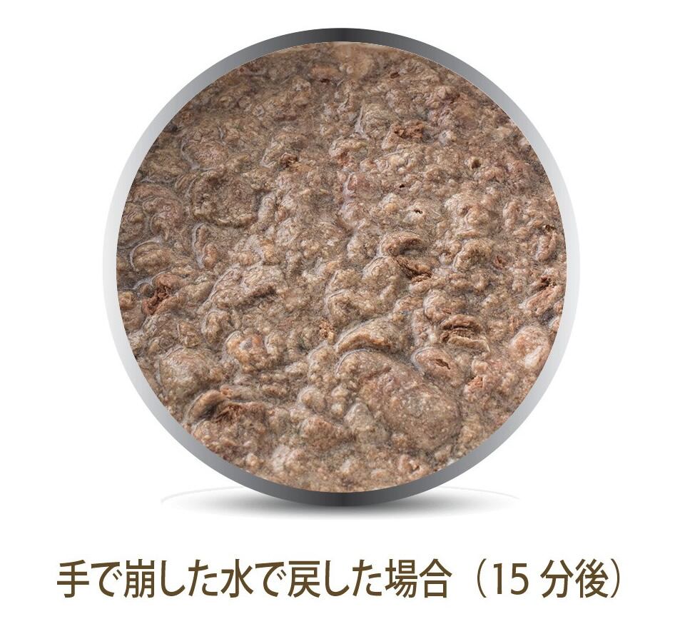 K9ナチュラルは、原材料の99%以上に自然食材を使用し、その栄養や風味を最大限に生かすため、原材料の加工を最小限に抑えながら、非加熱で製造しています。 そのため、原材料の収穫時期やサプライヤー(供給元)の違い、季節による家畜・家禽の脂肪分の違い、気候による野菜・果物などの成分の違いなど、素材の特長がそのまま、粒に反映されるため、保証成分値の範囲内ではありますが、粒の形状や、硬さ、色や香りなど、違いがあります。 また、一般的なドライフードのように、肉食動物である犬や猫にとって不要な、穀類・イモ類・豆類などの、粘性の高い、ツナギや量増しとしての原材料を一切、使用していないため、1粒1粒が柔らかく、簡単に、ほぐせるようになっています。 K9ナチュラルは、基本的な与え方として、本来の食事に近づけるために、生食の水分値に戻してから与えていただくフードですので、粉状になっているものはそのまま、粒状のものはくずしてから、水かぬるま湯(37℃以下)を加えると、短い時間で、戻ります。