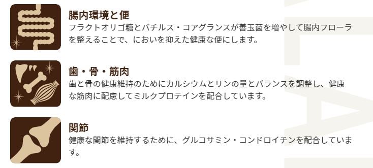 歯と骨の健康維持のためにカルシウムとリンの量とバランスを調整し、健康な筋肉に配慮してミルクプロテインを配合しています。