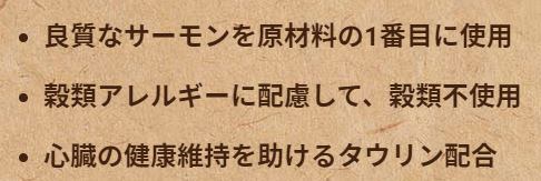 穀類アレルギーに配慮して、穀類不使用(グレインフリー)です。また心臓の健康維持のため、タウリンを配合しています。
