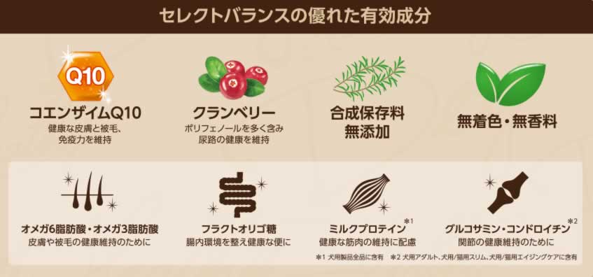 健康な関節を維持するために、グルコサミン・コンドロイチンを配合しています。原材料サーモン、乾燥サーモン、エンドウ豆、レンズ豆、ソラ豆、亜麻仁(オメガ6脂肪酸・オメガ3脂肪酸源)、エンドウ豆澱粉、ビール酵母、サーモンオイル、サツマイモ、ナチュラルフレーバー、キャノーラ油、乾燥ミルクプロテイン、タウリン、グルコサミン塩酸塩、コンドロイチン硫酸、DL-メチオニン、フラクトオリゴ糖、クランベリー、L-カルニチン、コエンザイムQ10、バチルス・コアグランスビタミン類(A、D3、E、B1、B2、B6、B12、ナイアシン、パントテン酸、葉酸、ビオチン、コリン)ミネラル類(ナトリウム、カルシウム、亜鉛タンパク質キレート、硫酸鉄、マンガンタンパク質キレート、ヨウ素、銅タンパク質キレート、セレン、コバルト)酸化防止剤(クエン酸、ミックストコフェロール、ローズマリー抽出物)保証成分たんぱく質30.0%以上脂肪12.0%以上粗繊維5.5%以下灰分8.0%以下水分10.0%以下カルシウム0.6%以上リン0.5%以上メチオニン0.3%以上セレクトバランス一覧ページ