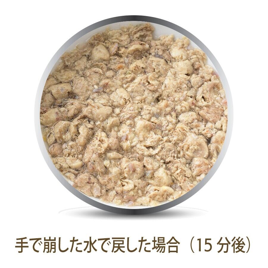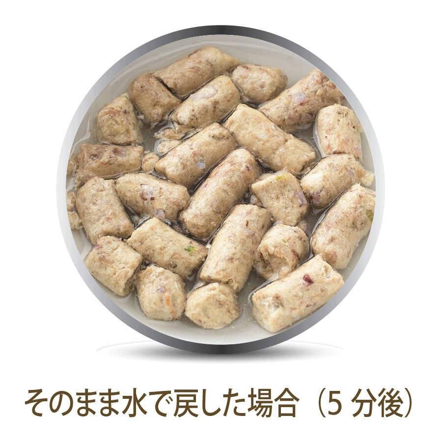 K9ナチュラルは、原材料の99%以上に自然食材を使用し、その栄養や風味を最大限に生かすため、原材料の加工を最小限に抑えながら、非加熱で製造しています。 そのため、原材料の収穫時期やサプライヤー(供給元)の違い、季節による家畜・家禽の脂肪分の違い、気候による野菜・果物などの成分の違いなど、素材の特長がそのまま、粒に反映されるため、保証成分値の範囲内ではありますが、粒の形状や、硬さ、色や香りなど、違いがあります。 また、一般的なドライフードのように、肉食動物である犬や猫にとって不要な、穀類・イモ類・豆類などの、粘性の高い、ツナギや量増しとしての原材料を一切、使用していないため、1粒1粒が柔らかく、簡単に、ほぐせるようになっています。 K9ナチュラルは、基本的な与え方として、本来の食事に近づけるために、生食の水分値に戻してから与えていただくフードですので、粉状になっているものはそのまま、粒状のものはくずしてから、水かぬるま湯(37℃以下)を加えると、短い時間で、戻ります。