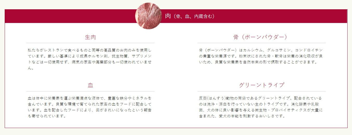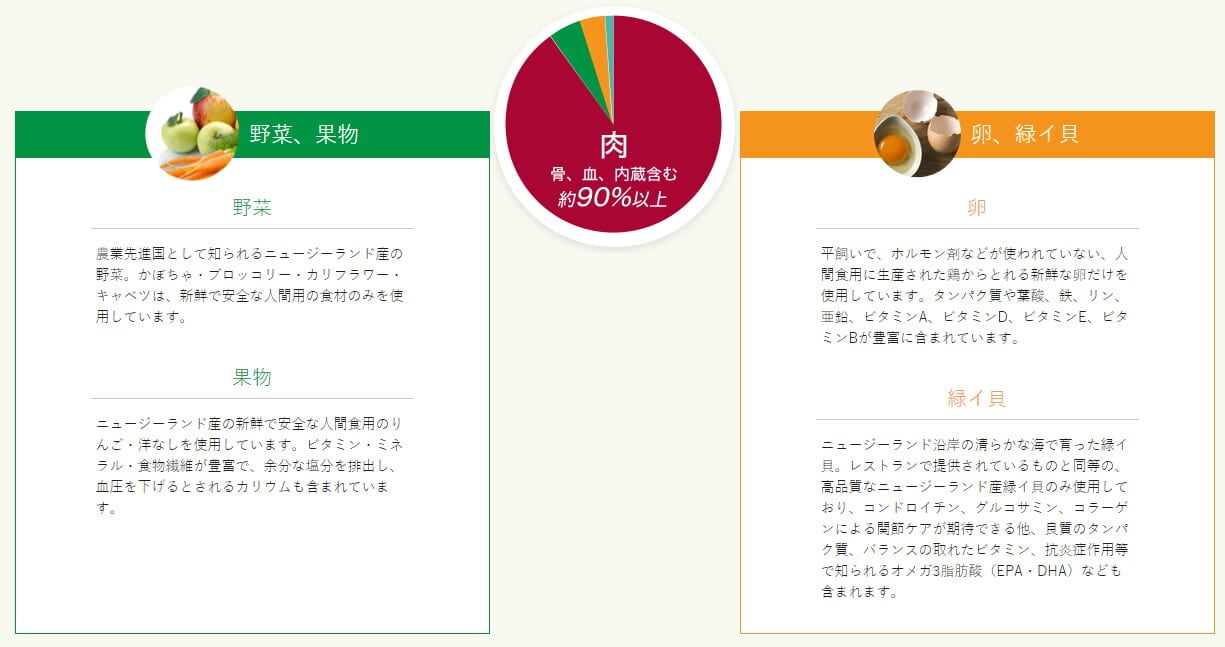 ホキ(白身魚)、牛肉(人間食用の家畜から生産される)、グリーントライプ(牛)、レバー(牛)、脾臓(牛)、腎臓(牛)、心臓(牛)、血(牛)、卵、ひまわり油、フラックスシードフレーク、昆布、ニュージーランド緑イ貝、かぼちゃ、ブロッコリー、カリフラワー、キャベツ、硫酸カリウム、乾燥昆布、りんご、洋なし、塩化ナトリウム、ビタミンE、プロティネイト亜鉛、プロティネイト鉄、酸化マグネシウム、セレン酵母、プロティネイト銅、プロティネイトマンガン、ベータカロチン、ビタミンB1、ビタミンD3