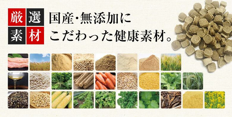 長期無薬飼育鶏ささみ(山口県産)、小麦粉(熊本県産)、米ぬか(熊本県産)、玄米(熊本 県産)、植物抽出酵素(国内産)、ふすま(国内産)、おから(国内産)、大麦(国内産)、雑穀 発酵調味液(国内産)、押麦(熊本県産)、大根葉(熊本県産)、ごぼう(熊本県産)、にんじ ん(北海道産)、ハト麦(北海道産)、あわ(北海道産)、キャベツ(熊本県産)、きび(北海道 産)、玄そば(北海道産)、大豆(国内産)、とうもろこし(北海道産)、白菜(長崎県産)、高 菜(熊本県産)、パセリ(熊本県産)、青じそ(宮崎県産)、鰹節(鹿児島県産)、卵殻カルシ ウム (国内産)、なたね油(国内産