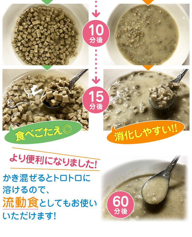 膨張剤や保存料を使わない代わりに、水分量を少なくしています。ごはんの際には、いつでもたくさんのお水を飲めるようにしておくか、いろいろな味のスープをかけて味の変化が楽しめるようにしてあげることがおすすめです。