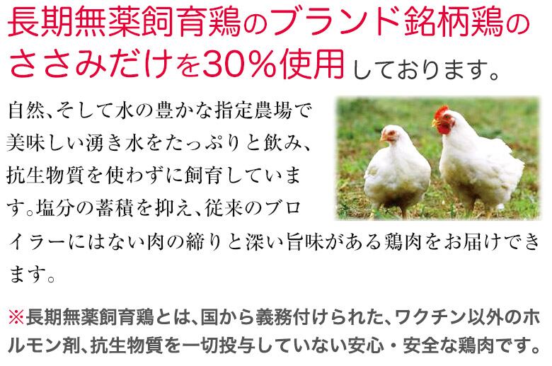 長期無薬飼育鶏ささみ(山口県産)、小麦粉(熊本県産)、米ぬか(熊本県産)、玄米(熊本 県産)、植物抽出酵素(国内産)、ふすま(国内産)、おから(国内産)、大麦(国内産)、雑穀 発酵調味液(国内産)、押麦(熊本県産)、大根葉(熊本県産)、ごぼう(熊本県産)、にんじ ん(北海道産)、ハト麦(北海道産)、あわ(北海道産)、キャベツ(熊本県産)、きび(北海道 産)、玄そば(北海道産)、大豆(国内産)、とうもろこし(北海道産)、白菜(長崎県産)、高 菜(熊本県産)、パセリ(熊本県産)、青じそ(宮崎県産)、鰹節(鹿児島県産)、卵殻カルシ ウム (国内産)、なたね油(国内産