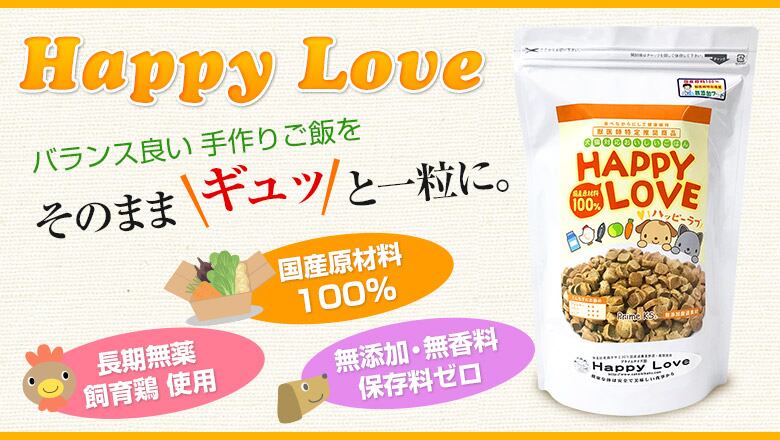 こだわりの国産・無添加ドライフード「HappyLove」人と同じ原材料だけでつくられた安心安全なドライフードです!