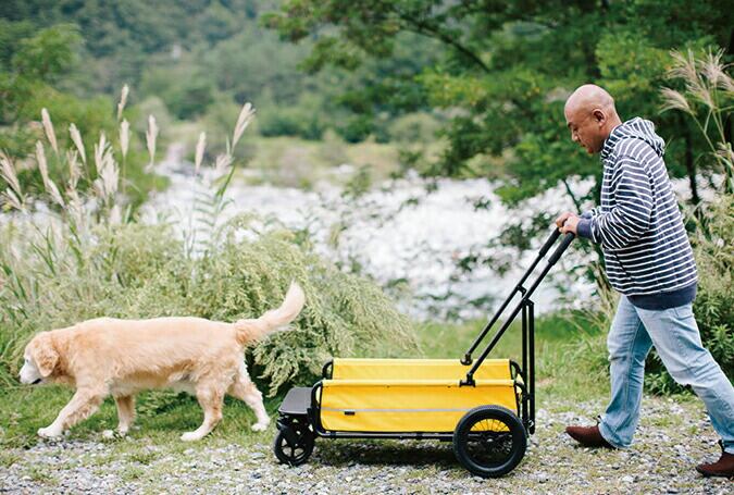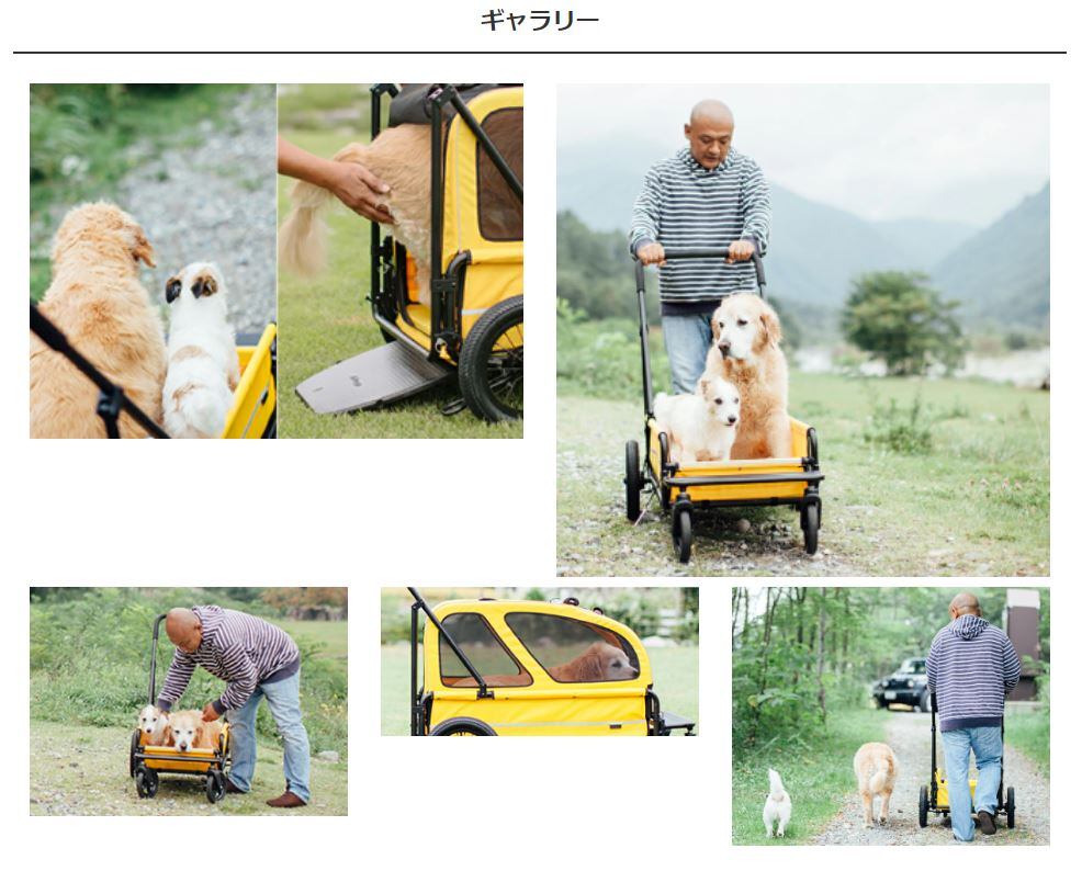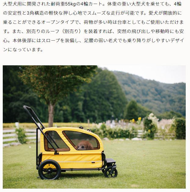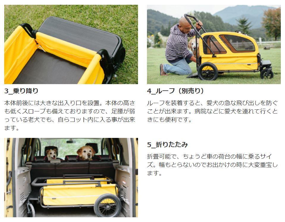 大型犬用に開発された耐荷重55kgの4輪カート。体重の重い大型犬を乗せても、4輪の安定性と3角構造の軽快な押し心地でスムーズな走行が可能です。愛犬が開放的に乗ることができるオープンタイプで、荷物が多い時は台車としてもご使用いただけます。また、別売りのルーフ(別売り)を装着すれば、突然の飛び出しや移動時にも安心。本体後部にはスロープを装備し、足腰の弱い老犬でも乗り降りがしやすいデザインになっています。