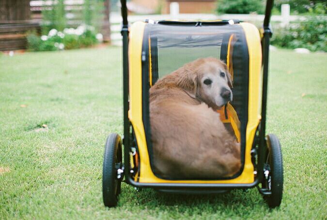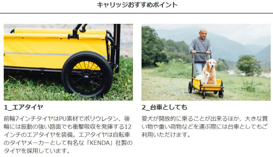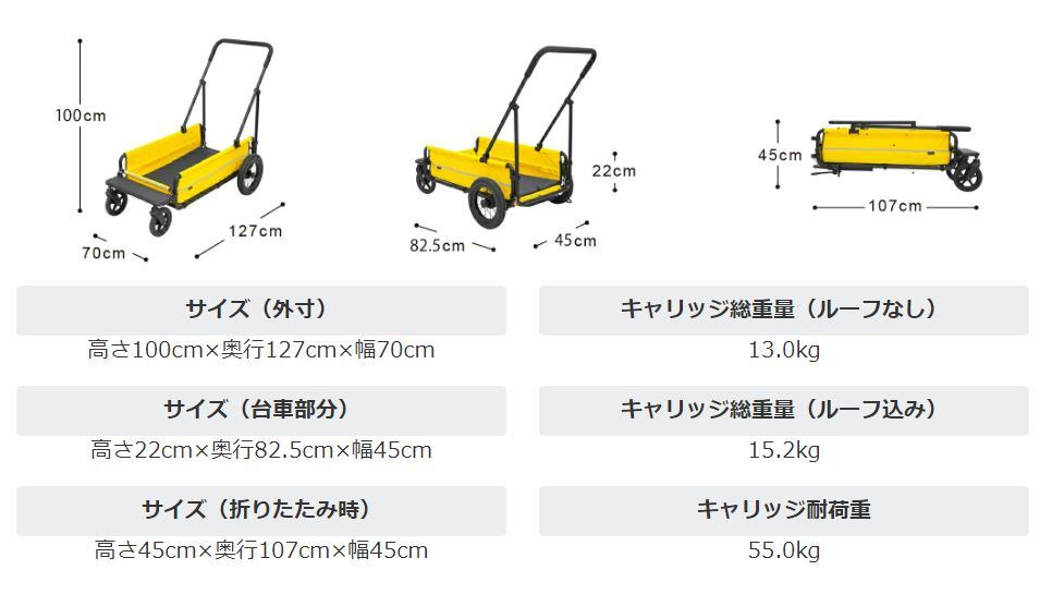 大型犬用に開発された耐荷重55kgの4輪カート。体重の重い大型犬を乗せても、4輪の安定性と3角構造の軽快な押し心地でスムーズな走行が可能です。愛犬が開放的に乗ることができるオープンタイプで、荷物が多い時は台車としてもご使用いただけます。また、別売りのルーフ(別売り)を装着すれば、突然の飛び出しや移動時にも安心。本体後部にはスロープを装備し、足腰の弱い老犬でも乗り降りがしやすいデザインになっています。