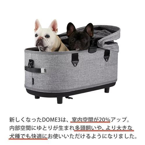 新しくなったDOME3は、室内空間が最大約20%アップ。内部空間にゆとりが生まれ、多頭飼いや、より大きな犬種でも快適にお使いいただけるようになりました。ドームは、180度開くアコーディオンルーフを採用。左右どちらからでもワンタッチで開閉できます。持ち運びは、両手のハンドルで安全に。エアバギーならでは快適な走り心地はそのままに、出入りしやすく、よりスマートに生まれ変わりました。