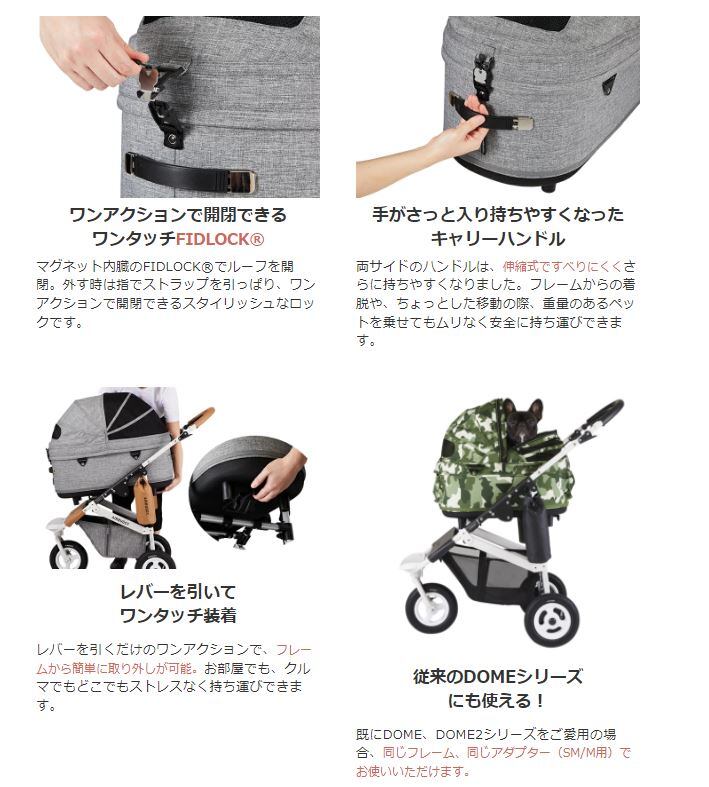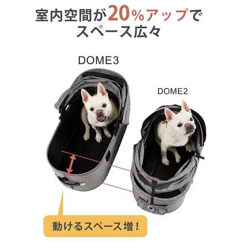 新しくなったDOME3は、室内空間が最大約20%アップ。内部空間にゆとりが生まれ、多頭飼いや、より大きな犬種でも快適にお使いいただけるようになりました。ドームは、180度開くアコーディオンルーフを採用。左右どちらからでもワンタッチで開閉できます。持ち運びは、両手のハンドルで安全に。エアバギーならでは快適な走り心地はそのままに、出入りしやすく、よりスマートに生まれ変わりました。