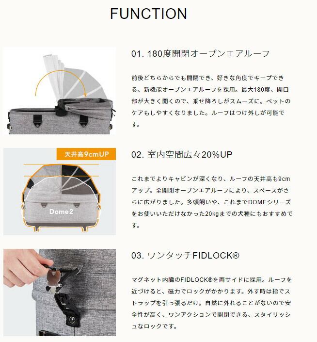 新しくなったDOME3は、室内空間が約20%アップ。内部空間にゆとりが生まれ、多頭飼いや、より大きな犬種でも快適にお使いいただけるようになりました。コットは180度開くオープンエアルーフを採用。左右どちらからでもワンタッチで開閉できます。持ち運びは、両手のハンドルで安全に。エアバギーならではの快適な走り心地はそのままに、出入りしやすく、よりスマートに生まれ変わりました。