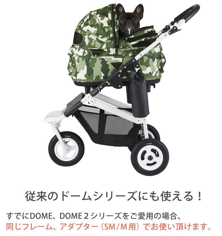 新しくなったDOME3は、コットの深さとルーフの天井高がアップ。DOME2シリーズと比べて内部空間にゆとりが生まれ、体高の高い犬種や、多頭飼育の方に快適にお使いいただけるようになりました。ルーフは180度開閉のアコーディオンルーフを採用。左右どちらからでもワンタッチで開閉できます。持ち運びは、両手のハンドルで安全に。従来のDOME/DOME2シリーズのフレームにも装着可能です。