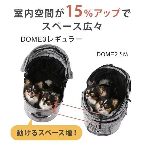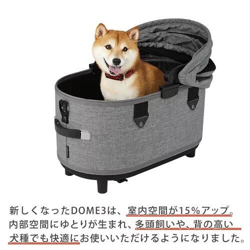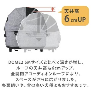 新しくなったDOME3は、コットの深さとルーフの天井高がアップ。DOME2シリーズと比べて内部空間にゆとりが生まれ、体高の高い犬種や、多頭飼育の方に快適にお使いいただけるようになりました。ルーフは180度開閉のアコーディオンルーフを採用。左右どちらからでもワンタッチで開閉できます。持ち運びは、両手のハンドルで安全に。従来のDOME/DOME2シリーズのフレームにも装着可能です。