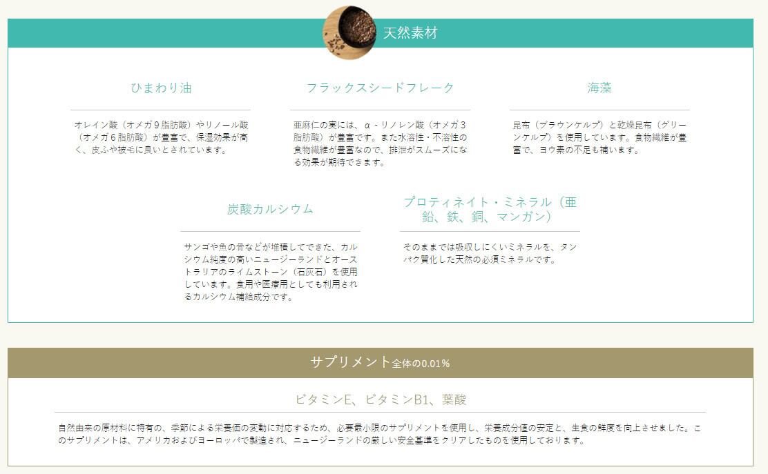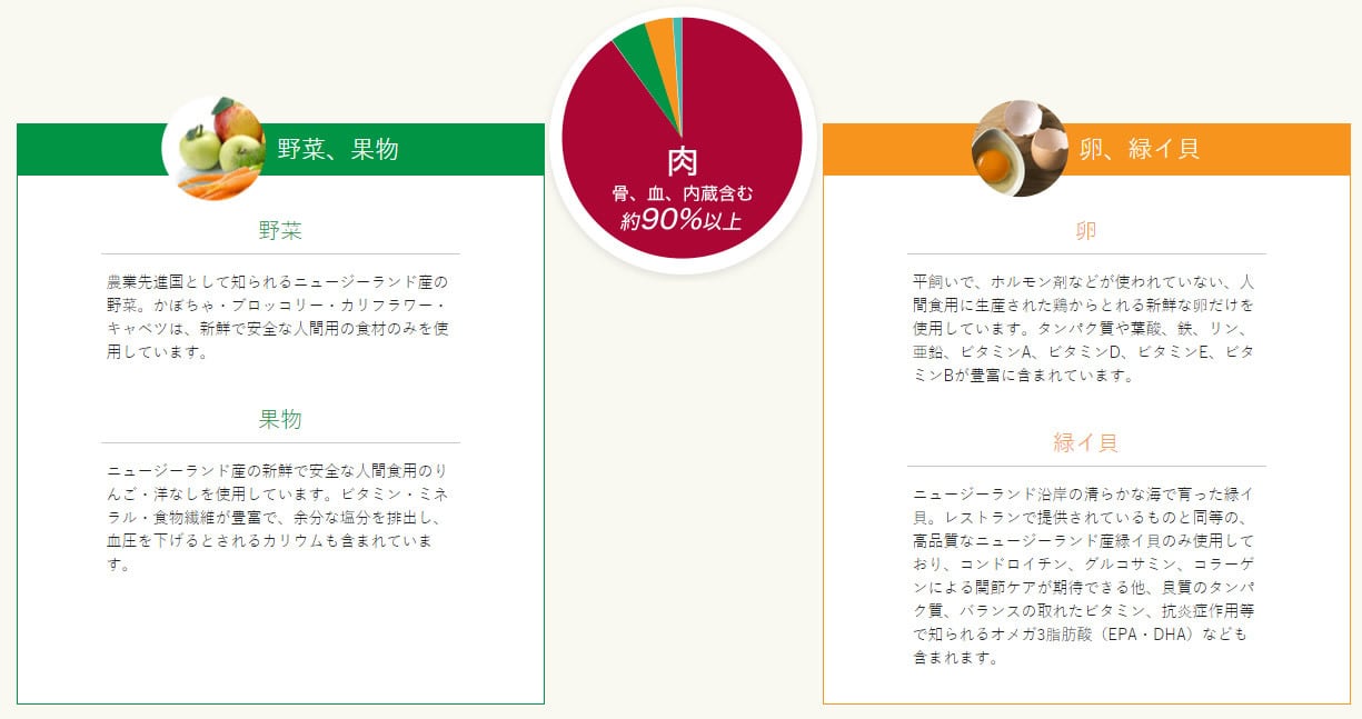 子羊肉(人間食用の家畜から生産される)、レバー(子羊)、心臓(子羊)、グリーントライプ(子羊)、血(子羊)、卵、脾臓(子羊)、腎臓(子羊)、骨(子羊)、ひまわり油、フラックスシードフレーク、昆布、ニュージーランド緑イ貝、かぼちゃ、ブロッコリー、カリフラワー、キャベツ、硫酸カリウム、乾燥昆布、りんご、洋なし、塩化ナトリウム、ビタミンE、プロティネイト亜鉛、プロティネイト鉄、酸化マグネシウム、セレン酵母、プロティネイト銅、プロティネイトマンガン、ベータカロチン、ビタミンB1、ビタミンD3