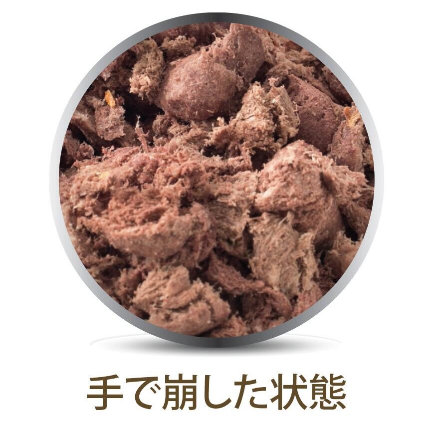 K9ナチュラルは、原材料の99%以上に自然食材を使用し、その栄養や風味を最大限に生かすため、原材料の加工を最小限に抑えながら、非加熱で製造しています。 そのため、原材料の収穫時期やサプライヤー(供給元)の違い、季節による家畜・家禽の脂肪分の違い、気候による野菜・果物などの成分の違いなど、素材の特長がそのまま、粒に反映されるため、保証成分値の範囲内ではありますが、粒の形状や、硬さ、色や香りなど、違いがあります。 また、一般的なドライフードのように、肉食動物である犬や猫にとって不要な、穀類・イモ類・豆類などの、粘性の高い、ツナギや量増しとしての原材料を一切、使用していないため、1粒1粒が柔らかく、簡単に、ほぐせるようになっています。 K9ナチュラルは、基本的な与え方として、本来の食事に近づけるために、生食の水分値に戻してから与えていただくフードですので、粉状になっているものはそのまま、粒状のものはくずしてから、水かぬるま湯(37℃以下)を加えると、短い時間で、戻ります。