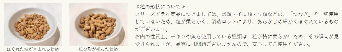 フリーズドライ商品につきましては、穀類・イモ類・豆類などの、「つなぎ」を一切使用していないため、粒が柔らかく、製造ロットにより、あらかじめ細かくほぐれているものがございますが、品質には問題ございませんので、安心してご使用ください。